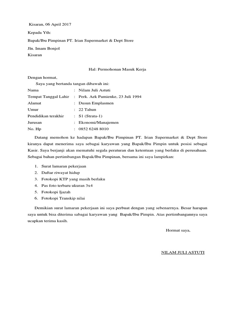 Download NowContoh Surat Lamaran Kerja Di Supermarket Irian Yang Benar Dan Tepat