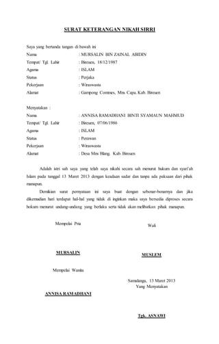 Download NowPernyataan Helmi Jadi Saksi Nikah Siri Bukan Dari Ketua Rt Garuda DailyNah itu lah beberapa contoh Surat Nikah Siri yang bisa kamu download gratis dari website ini, tentu gambar diatas akan kami tambah kembali berikut ini:
